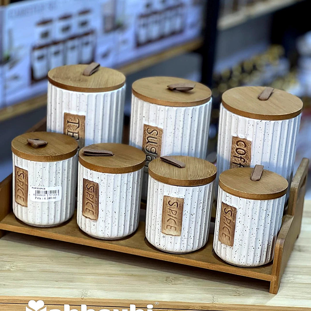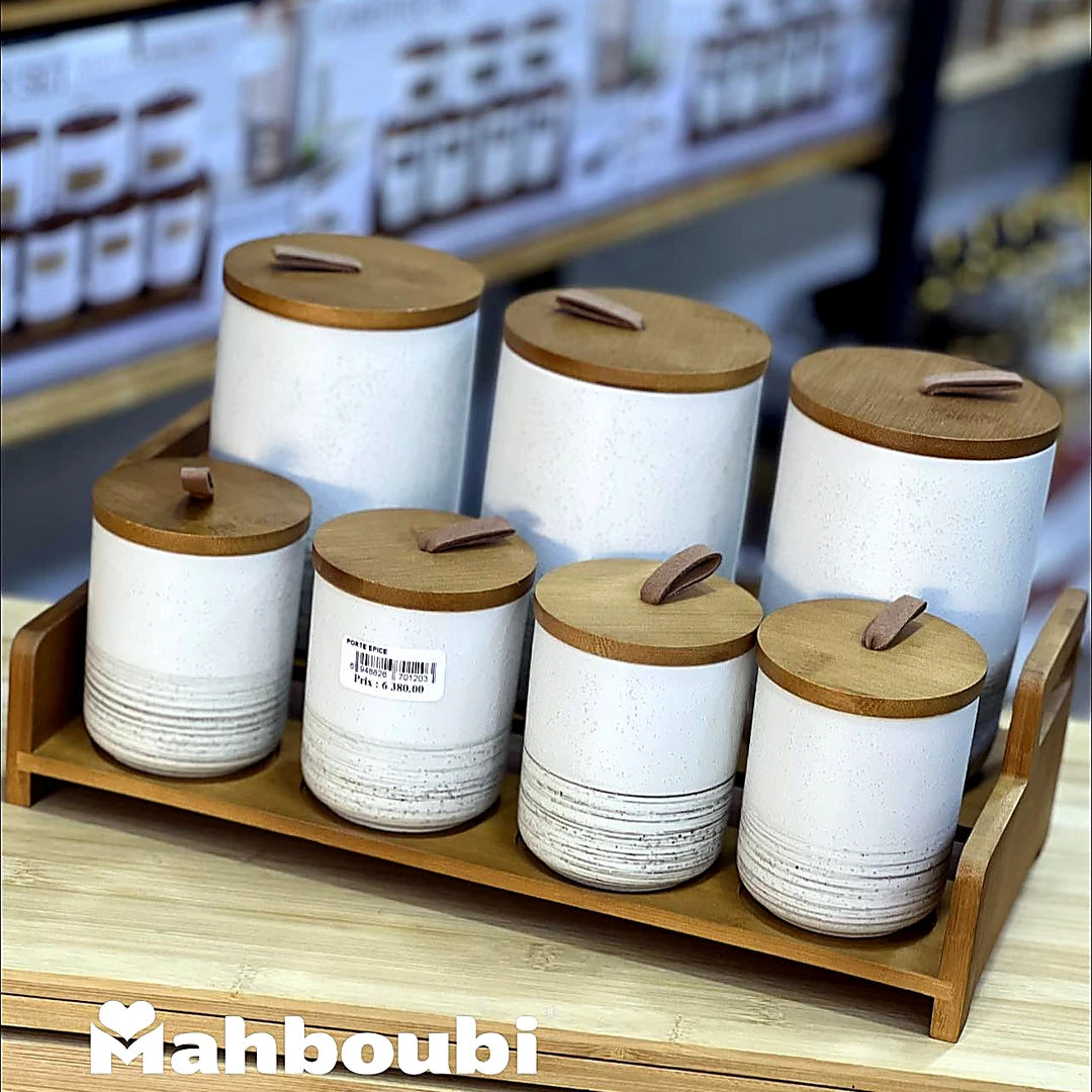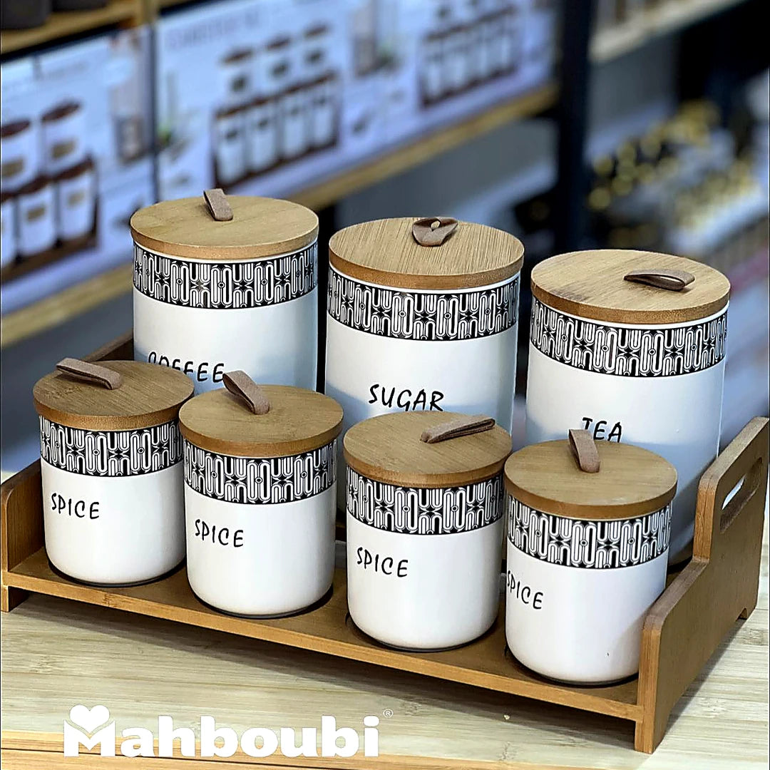 طقم علب مطبخ راقي – بورسلان + خشب طبيعي ✨