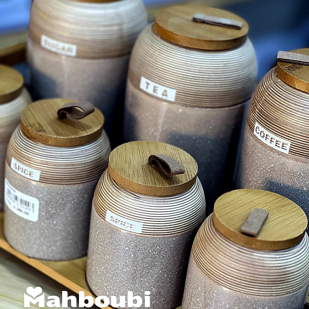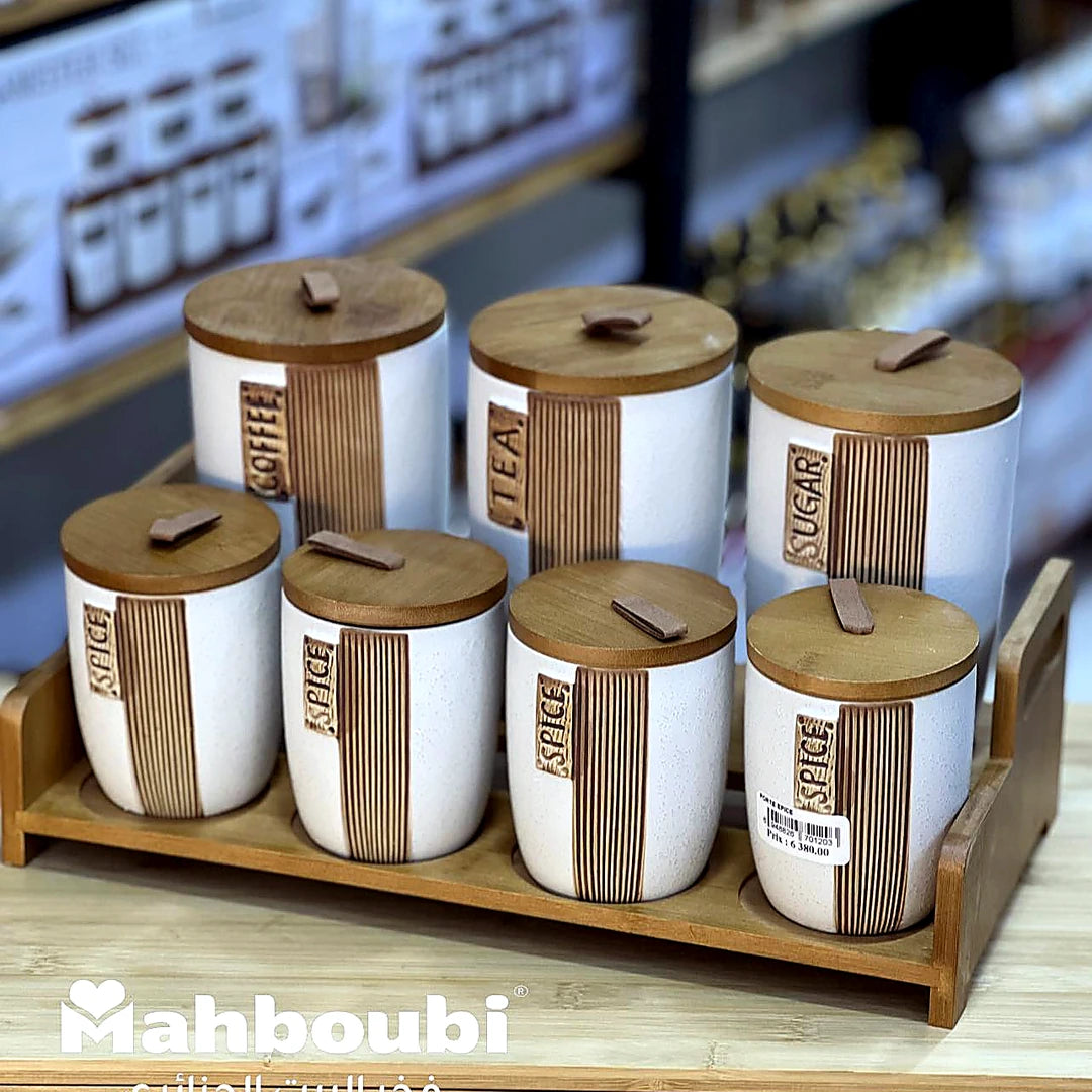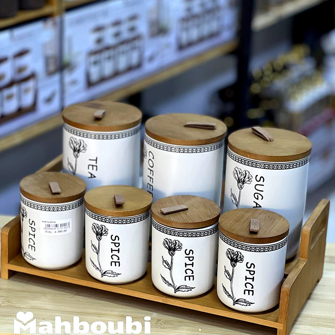 طقم علب مطبخ راقي – بورسلان + خشب طبيعي ✨